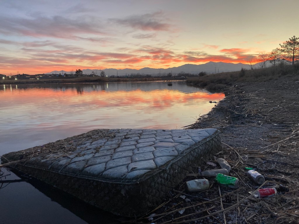 I had some time to kill on a Thursday night so I decided to do a couple of laps on the trail around the lake. I started my hike on the north end of the lake. Walking clockwise, I noticed a fair amount of garbage on the shore, including a mattress that someone had dumped in the lake.